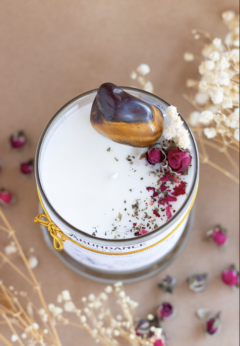 This candle is infused with specific herbs and oils used to manifest abundance, prosperity, and expansion on all levels. Infused with patchouli and rose essential oil, patchouli known in aromatherapy to ease tension, revitalize and stabilize. Rose is known in aromatherapy to sooth anxiety and stress. More info about the healing properties and aromatherapy benefits come with the candle.