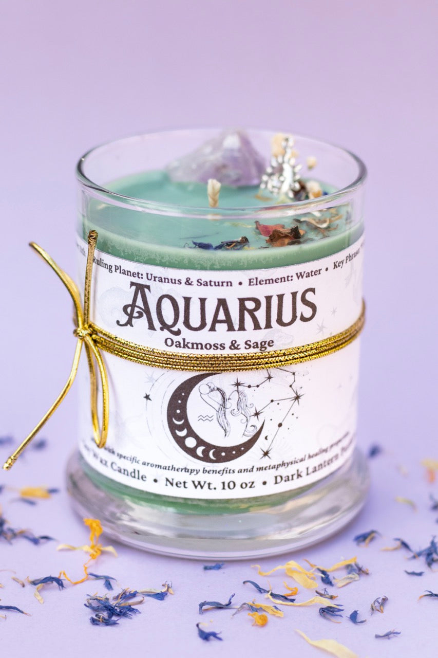 The glyph for Aquarius depicts water pouring out of the bearer’s vessel symbolizing an overflow of spiritual energy. Aquarians tend to be natural humanitarians, they have a keen concern with raising the vibration of humanity, which keeps them close to spirit. When your vibration is high, you are a natural empath, which means it's important to keep your energy protected and cleanse yourself from all of the energy you come into contact with. You need to fill your own cup before you can pour into someone else's, which is why this candle is infused with sage essential oil. Sage helps cleanse, purify, and release residual stagnant energy. It also releases negative ions when burned, which is linked to having positive effects on the body. More info about the healing properties and aromatherapy benefits come with the candle.