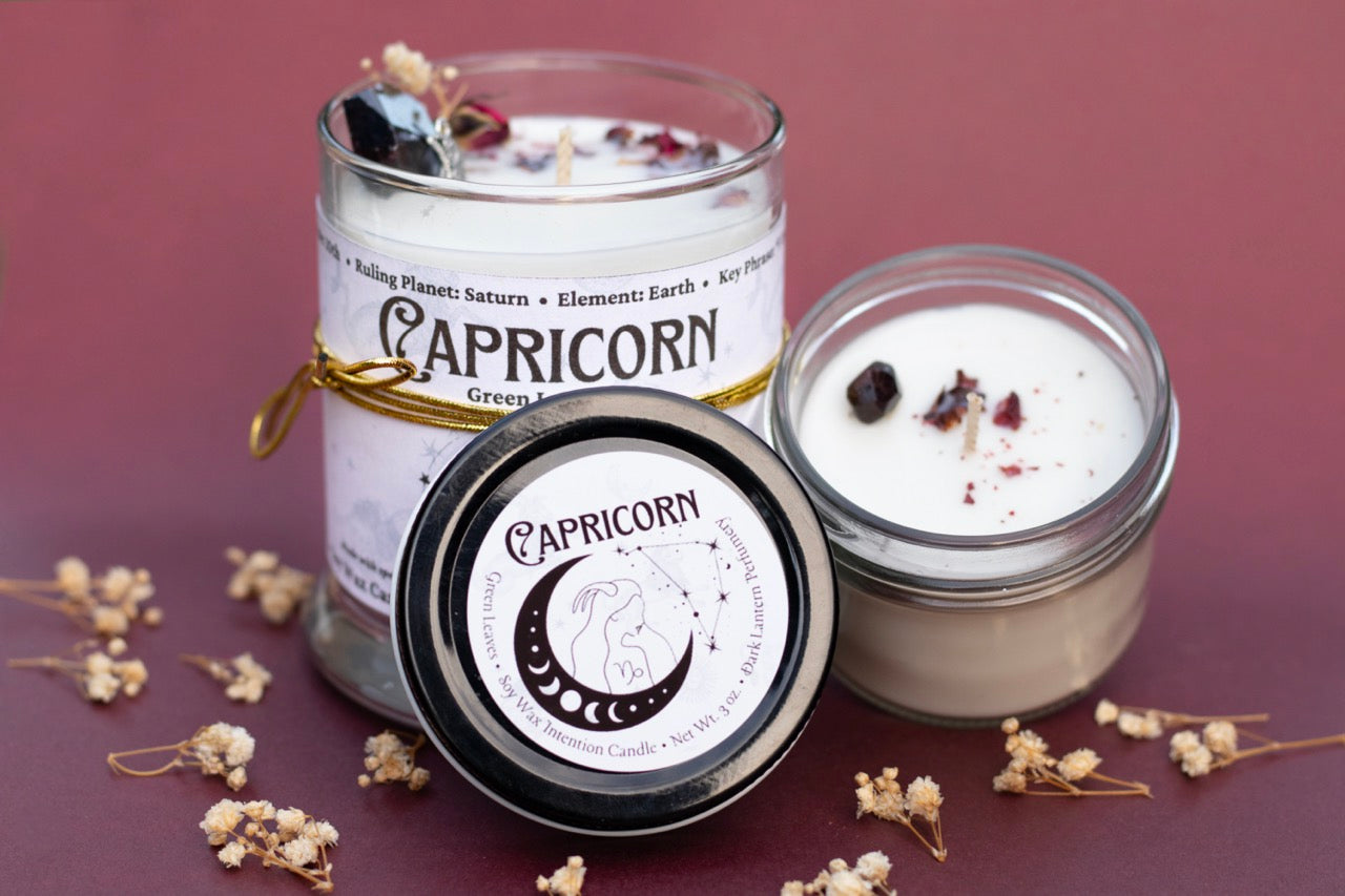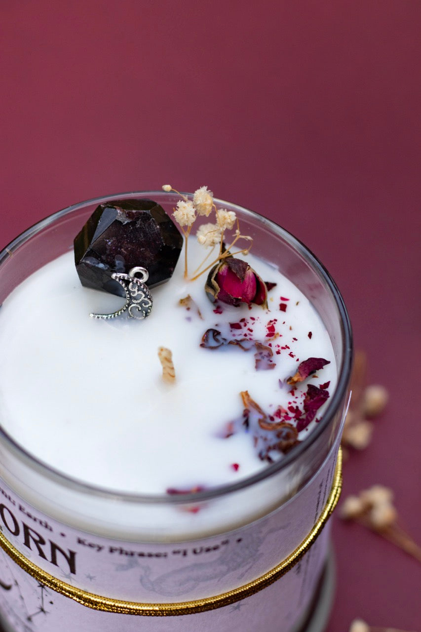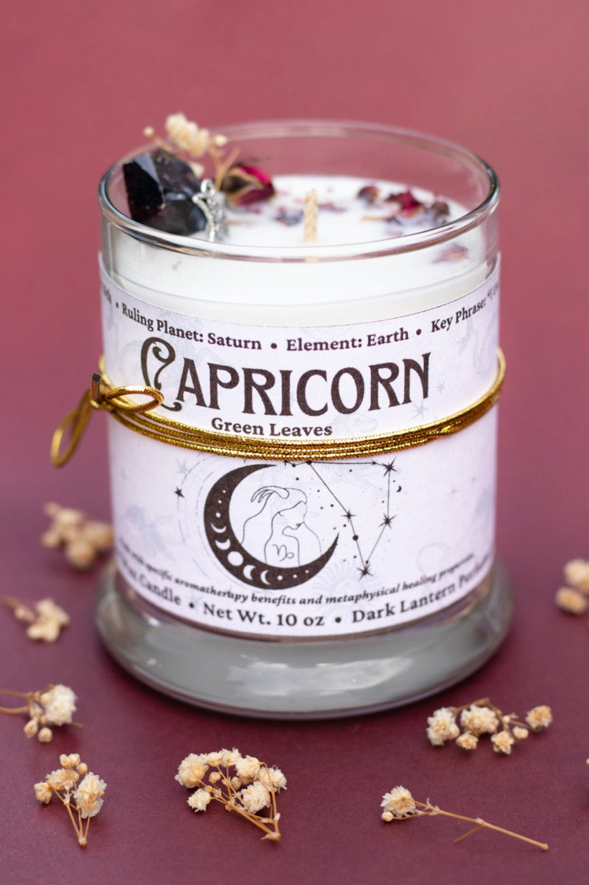 The symbol for Capricorn depicts a goat with the tail of a fish, most often compared to the mountain goat. Capricorns are thought to be loners at heart, with introverted characters. Mountain goats find security in cliffs and heights–the highest places that can be climbed. Capricorn is a feet-on-the-ground, eye-on-the-prize sign. Capricorns tend to have a realistic, grounded approach to life, which is why this candle is infused with sage essential oil. Sage releases negative ions when burned, which is linked to having positive effects on the body. Sage also aids in cleansing and purifying the body and mind, helping to keep the Capricorn feeling grounded and stable. More info about the healing properties and aromatherapy benefits come with the candle.