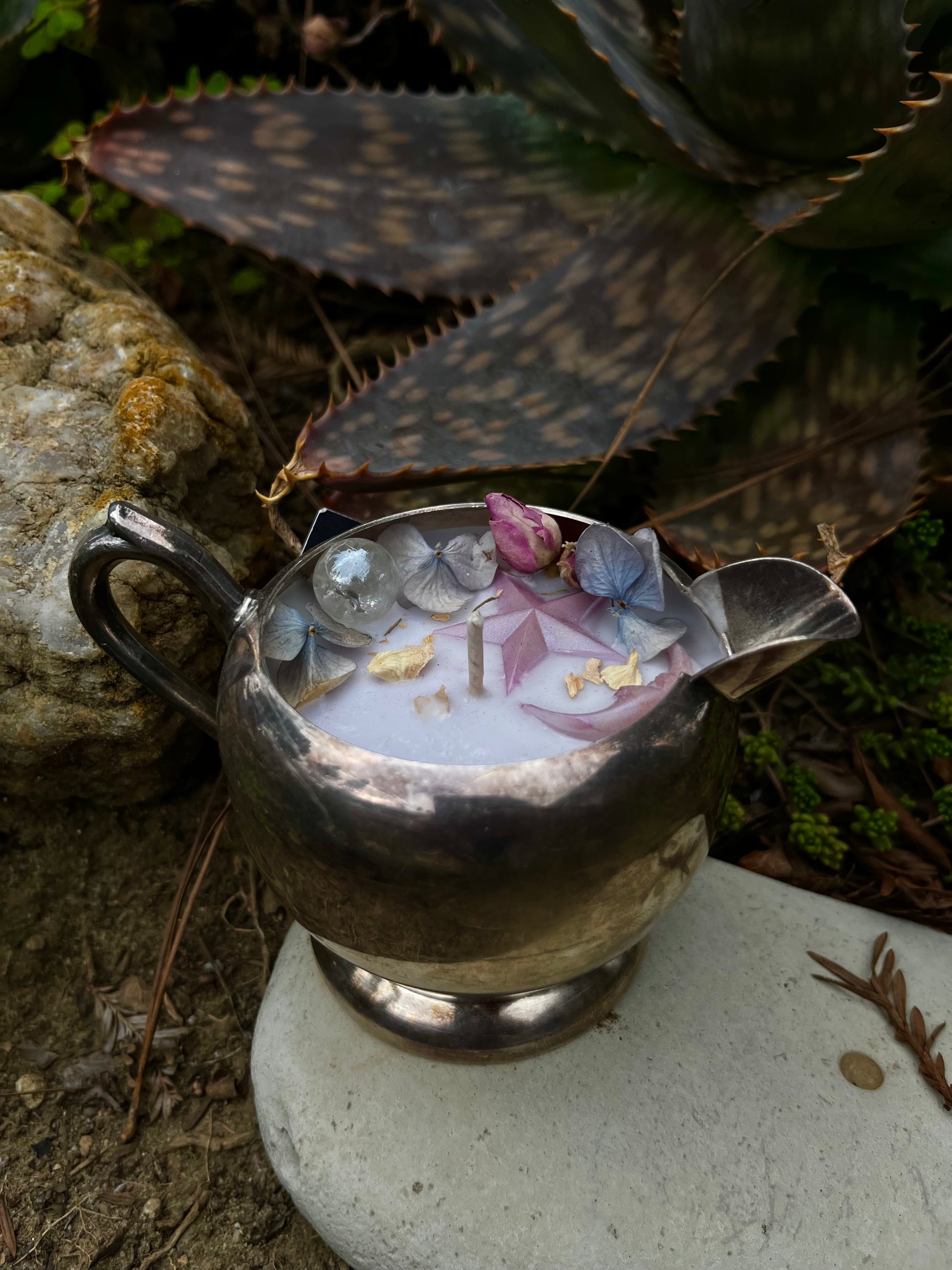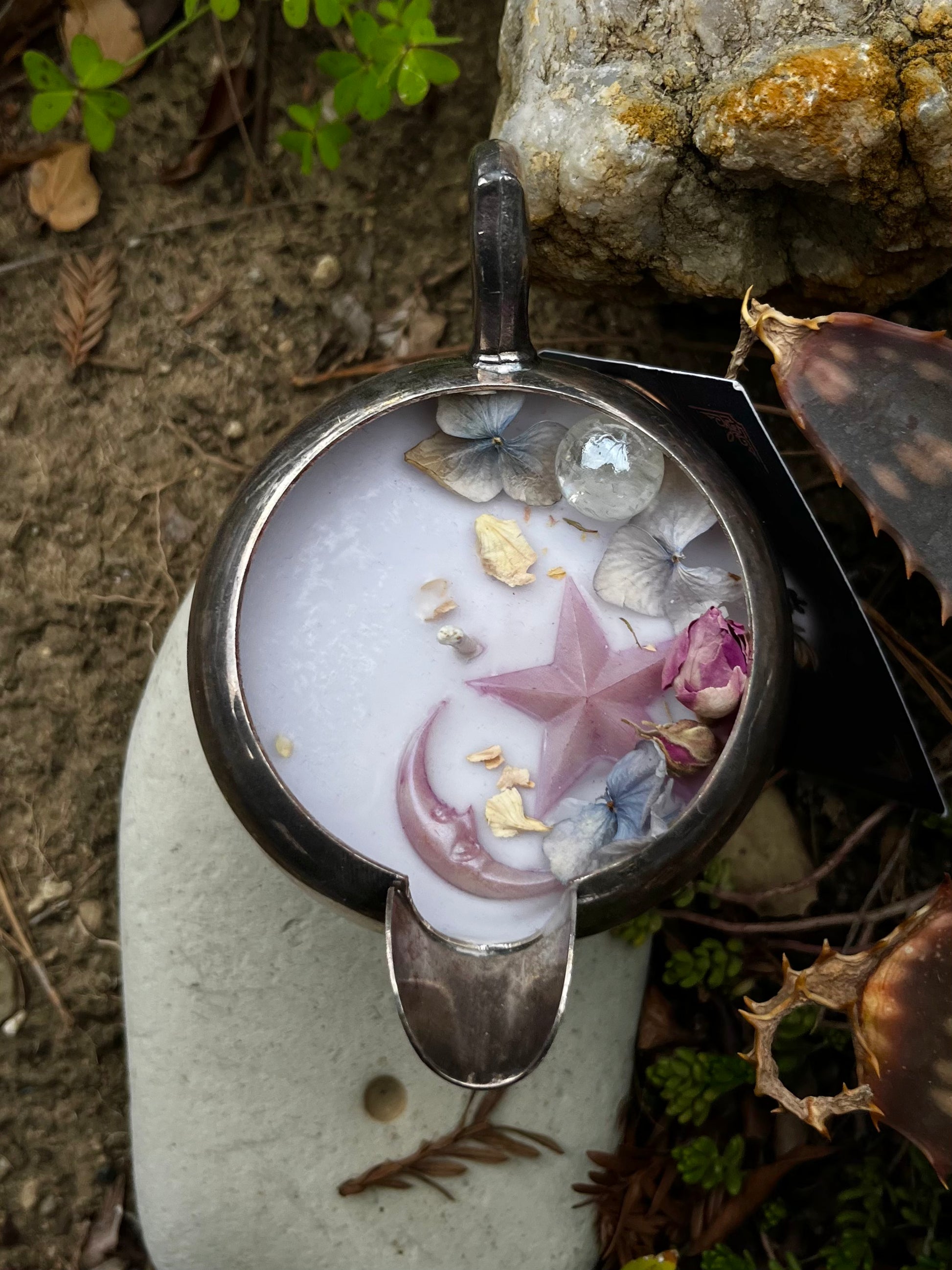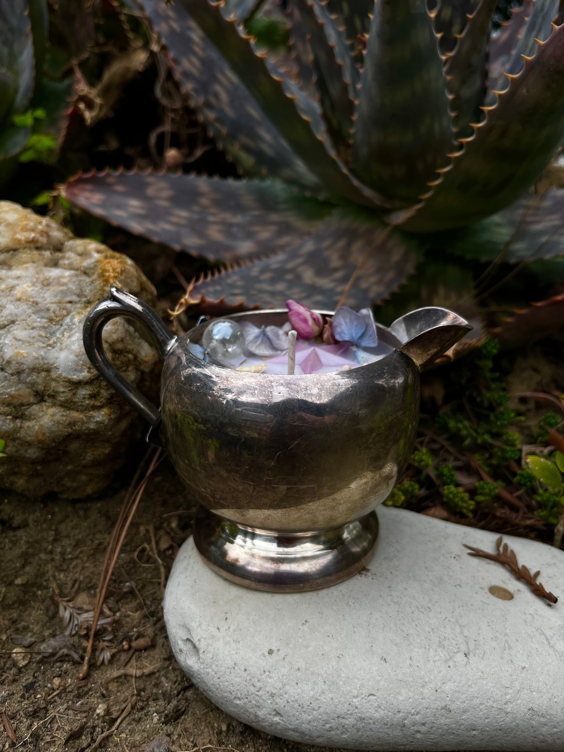 One of a kind candle handmade in a pewter vessel. A lovely candle to use for intention setting, or just for aesthetic purposes, and a great vessel to repurpose for incense burning, making black salt, bay leaf burning, or whatever your witchy heart desires.