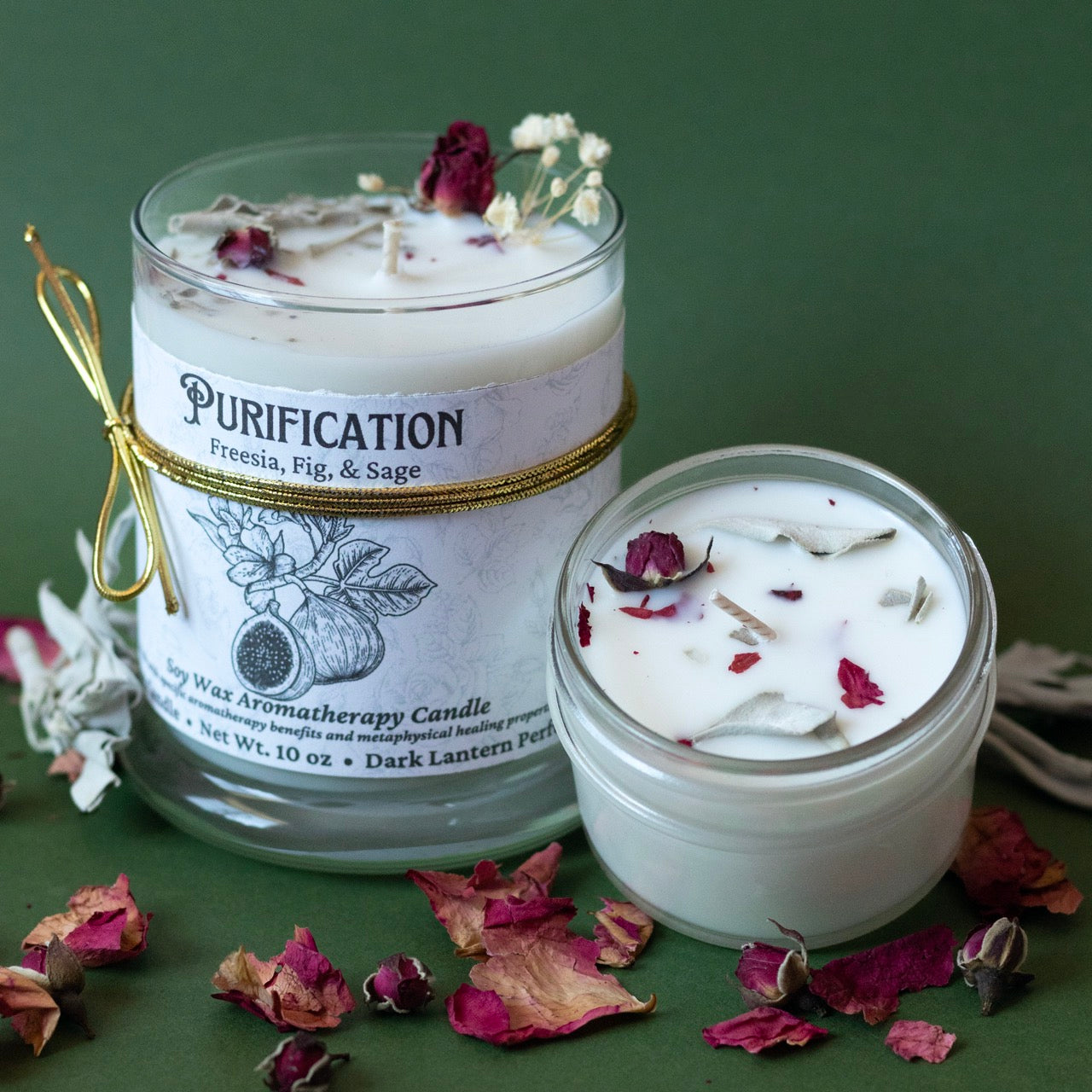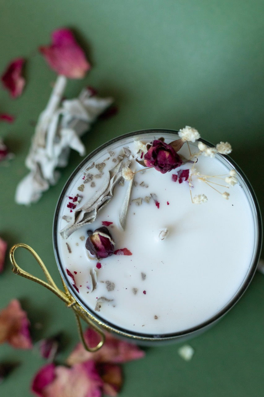 This candle is infused with various herbs and oils to aid in banishing negative energy and cleansing a space. Sage is known to release and banish residual negative energy, and promote calm and peaceful energy. Sage releases negative ions when burned which is scientifically linked to having positive effects of the body and mind. All herbs on top this candle are safe to burn, or use as incense. Rose herb is commonly used in magic to attract love energy, and sometimes protection energy. More info about the healing properties and aromatherapy benefits come with the candle.