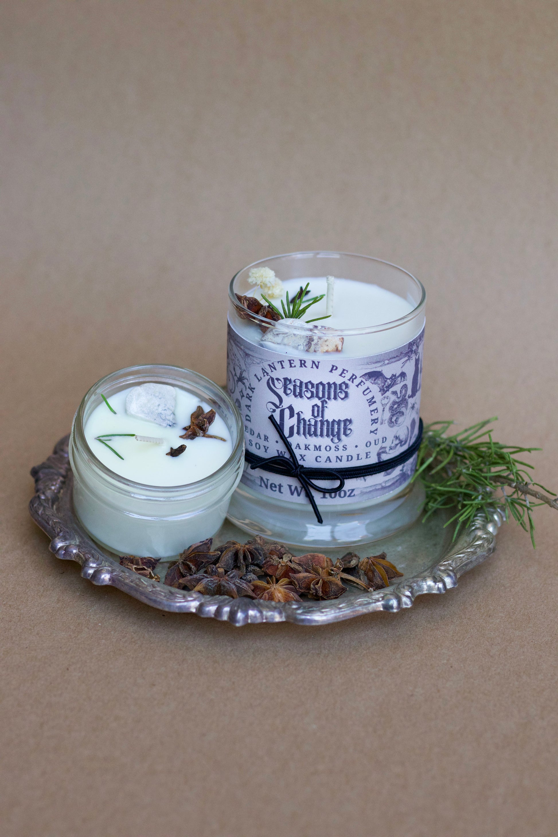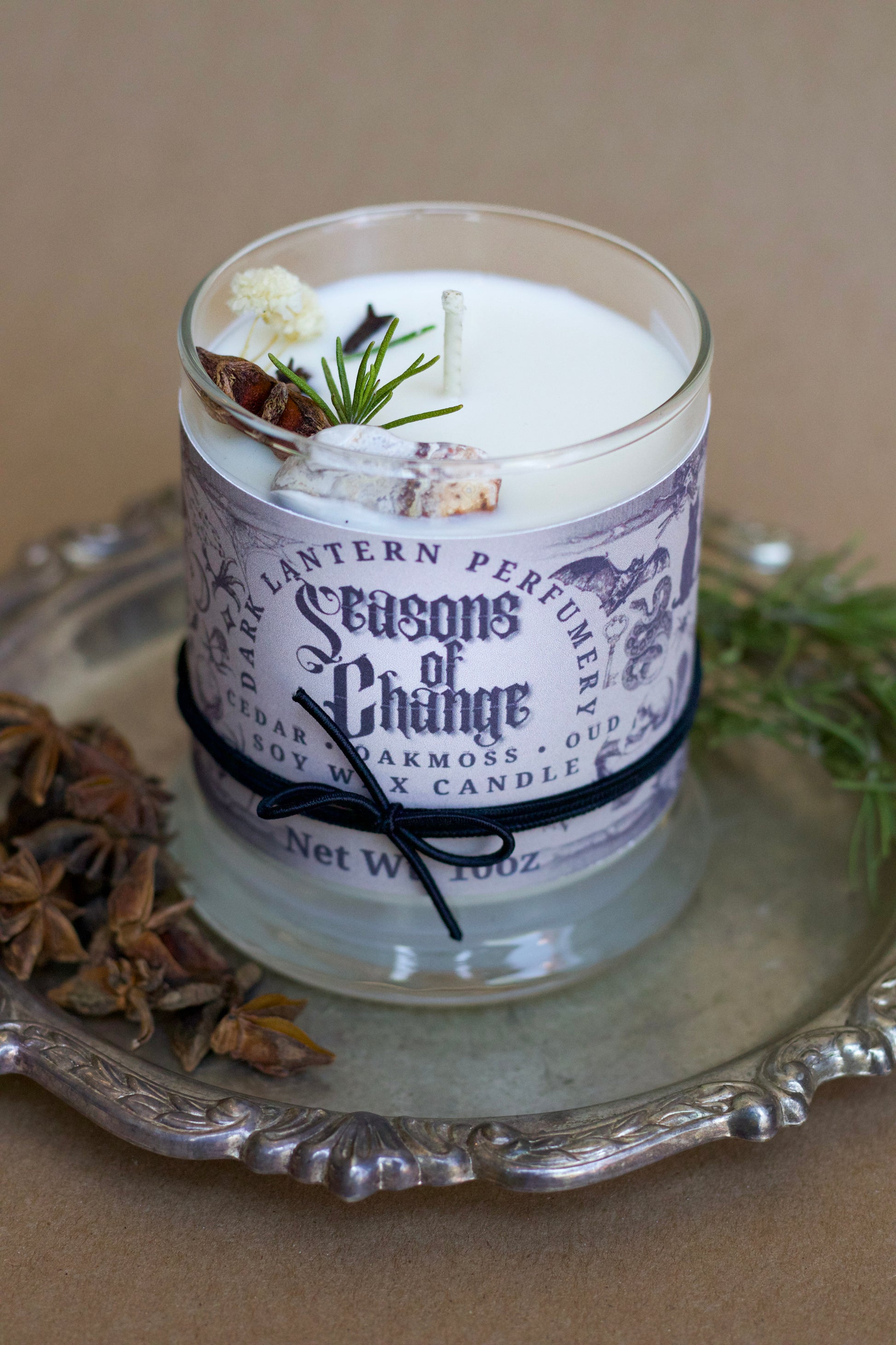 The fragrance of this candle is reminiscent of the seasons changing, and leaves falling, here to remind us that all seasons must come to an end. This candle helps to usher in any changes that are needed and help make any transitions as smooth as possible. This candle is infused with specific essential oils and dressed with herbs to help in assisting during changes, including rosemary and cedarwood essential oil. More info about the healing properties and aromatherapy benefits come with the candle.