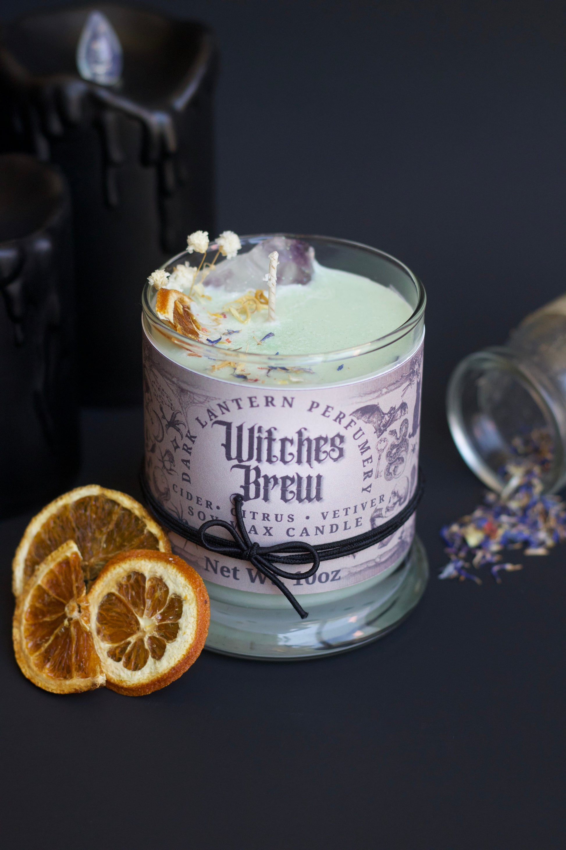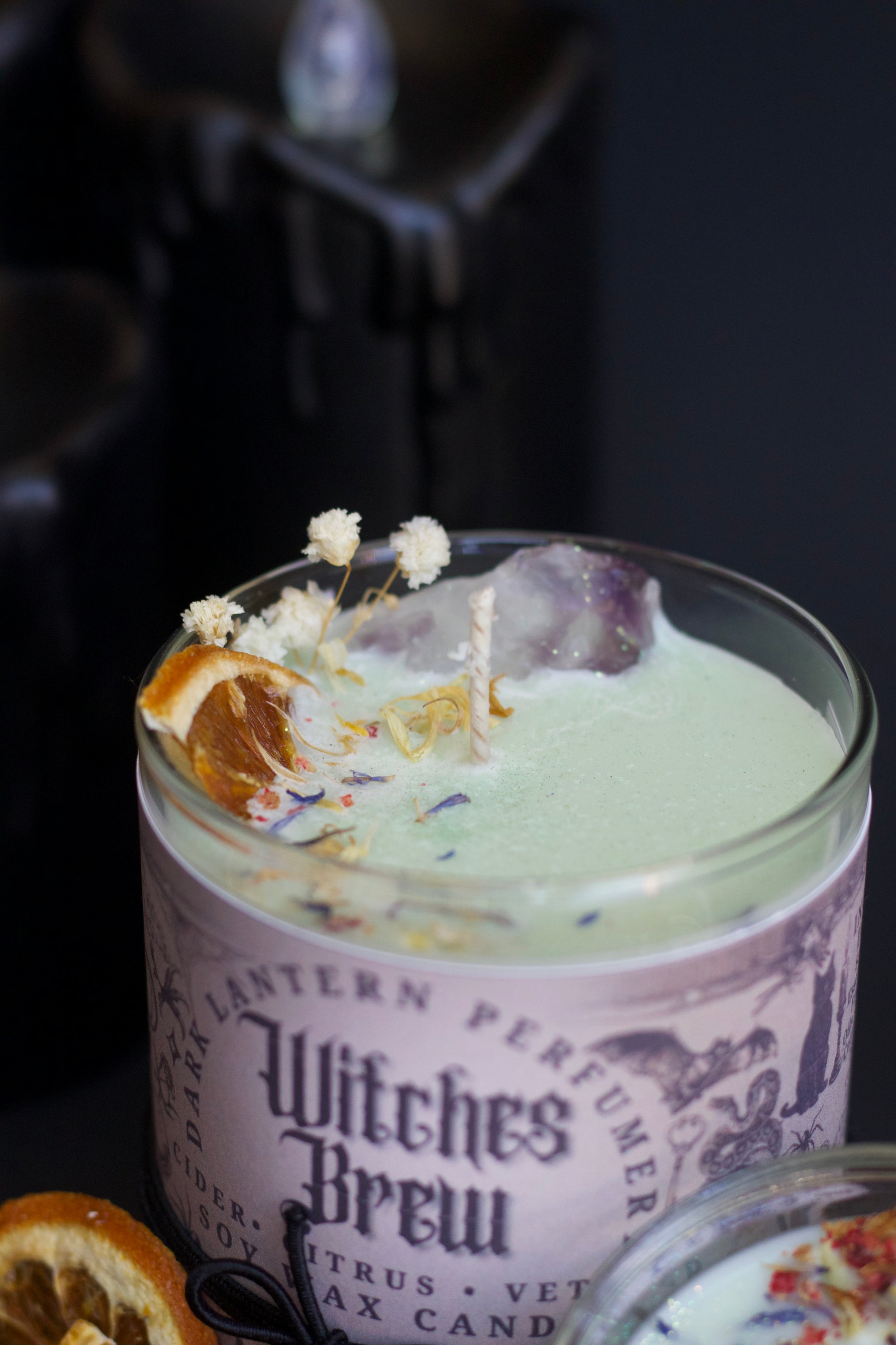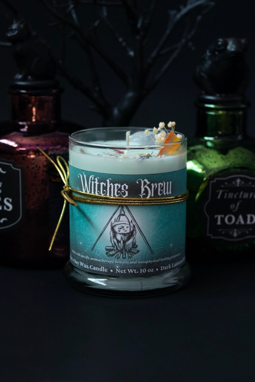 Help open your third eye and bring vitality to your intention setting with this thoughtfully made Witch’s Brew candle. Infused into this candle is orange and vetiver essential oil. Orange essential oil is a mood booster due to its main chemical component, limonene. Limonene is naturally found in the peels of citrus fruits. Vetiver is sometimes inhaled as aromatherapy for nervousness, insomnia, and joint and muscle pain. More info about the healing properties and aromatherapy benefits come with the candle.