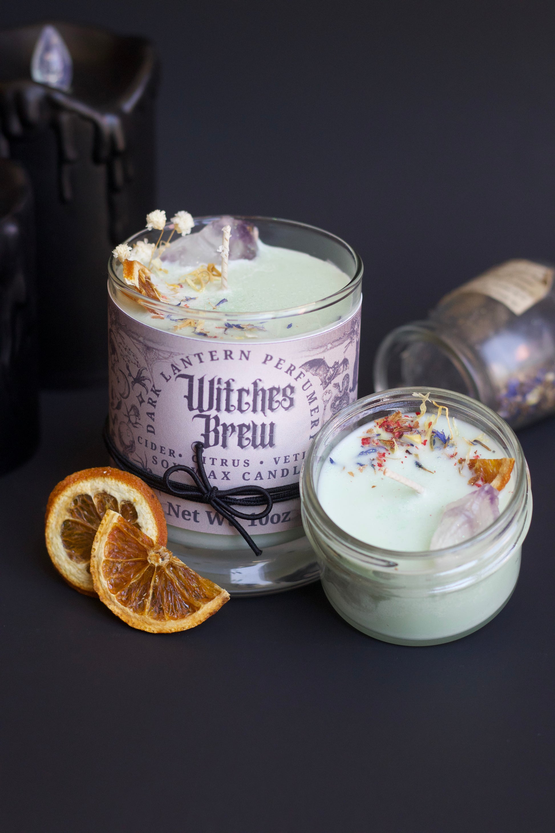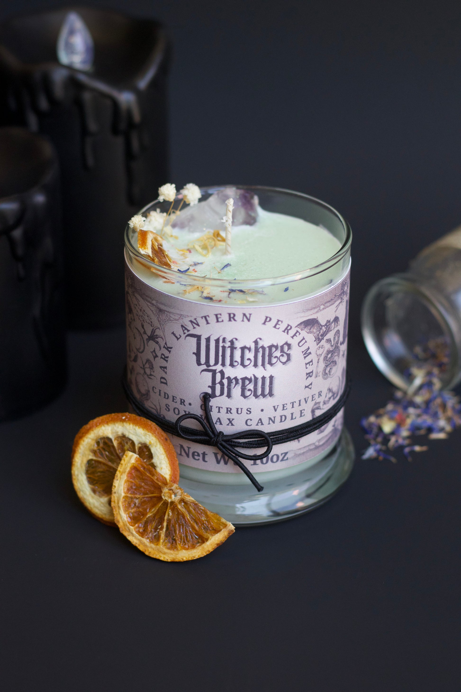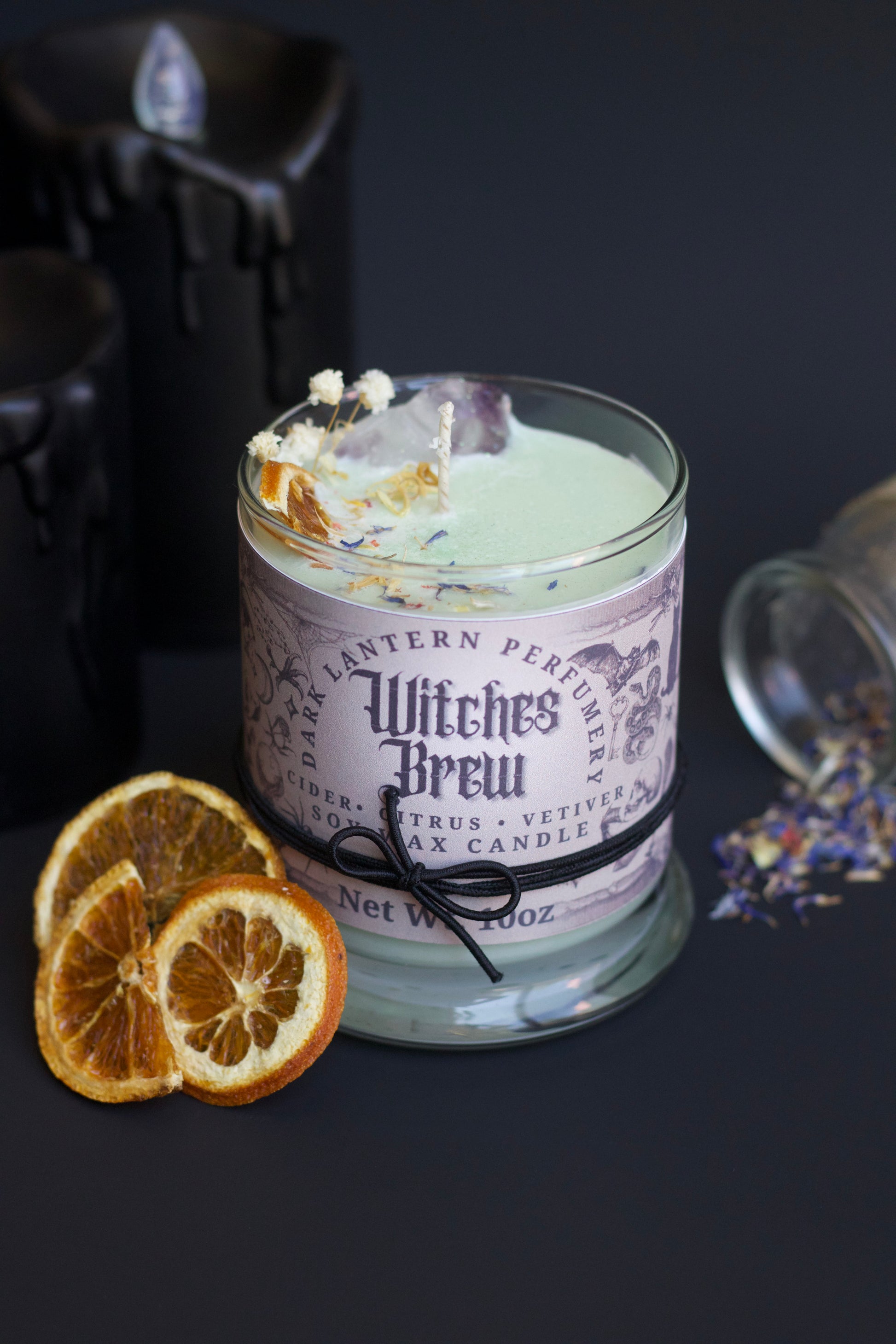 Help open your third eye and bring vitality to your intention setting with this thoughtfully made Witch’s Brew candle. Infused into this candle is orange and vetiver essential oil. Orange essential oil is a mood booster due to its main chemical component, limonene. Limonene is naturally found in the peels of citrus fruits. Vetiver is sometimes inhaled as aromatherapy for nervousness, insomnia, and joint and muscle pain. More info about the healing properties and aromatherapy benefits come with the candle.